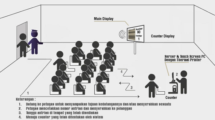 Staff pelayanan yang telah selesai memberikan layanan kepada pelanggan akan menekan tombol yang telah disediakan untuk memanggil pelanggan berikutnya. Nomor antrian yang akan dilayani akan diinformasikan kepada pelanggan secara visual (multimedia display) maupun audio (voice announcement).